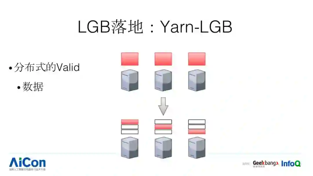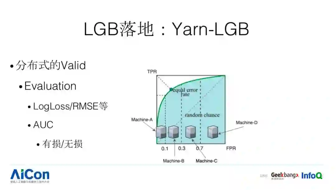 LGB 在分布式的 valid 是每台机器加载一份,当数据规模比较大的时候会出现什么问题?会 OOM,所以一个简单的方法是我们把对应的 data 进行分布式拆分。我们再看分布式 Evaluation 怎么做,指标分两种类型:第一种是 LogLoss/RMSE 等,计算完了,求个平均或者累加就可以了;第二种是 AUC,可以简单求平均,但不够准确,针对这样的指标,我们会做特殊的优化,使得分布式评估会更加准。