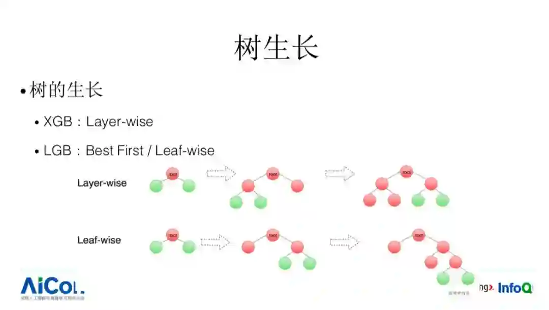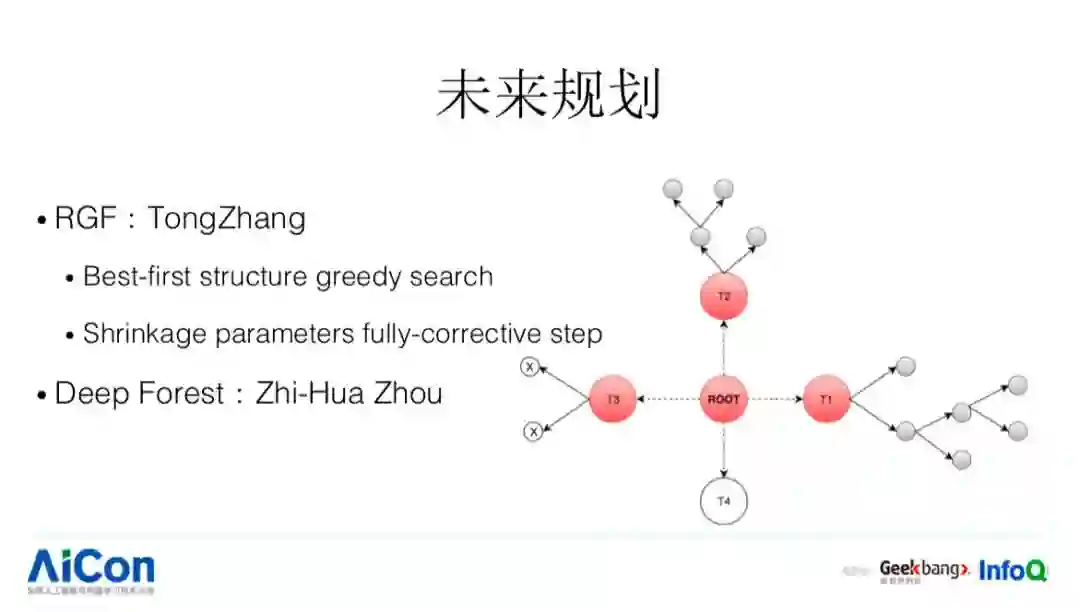 第一个,这里有两个工作。RGF,是张潼老师的工作,针对于刚才 best first 树的生长方式它又走了一步,我们刚才说的树的生长方式只是限制在一棵树内部,他把这个思路放得更加开阔,比如有已经成型的树,去进行筛选的时候,不单单考虑我这棵树自己本身,可以新开一棵树,这样可能带来更好的精度提升。