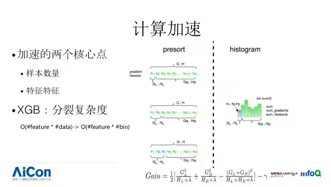 有 N 个 feature,我需要挑选出来一个,每个 feature 内部还有 M 个对应的 Split Value,我需要过一遍 data,这个工作量是非常大的,一个简单的优化方式是,我可以把我对应的 Split Value 进行分桶,在分裂的时候不需要过每个 date,我们提前做好预先计算就可以了。