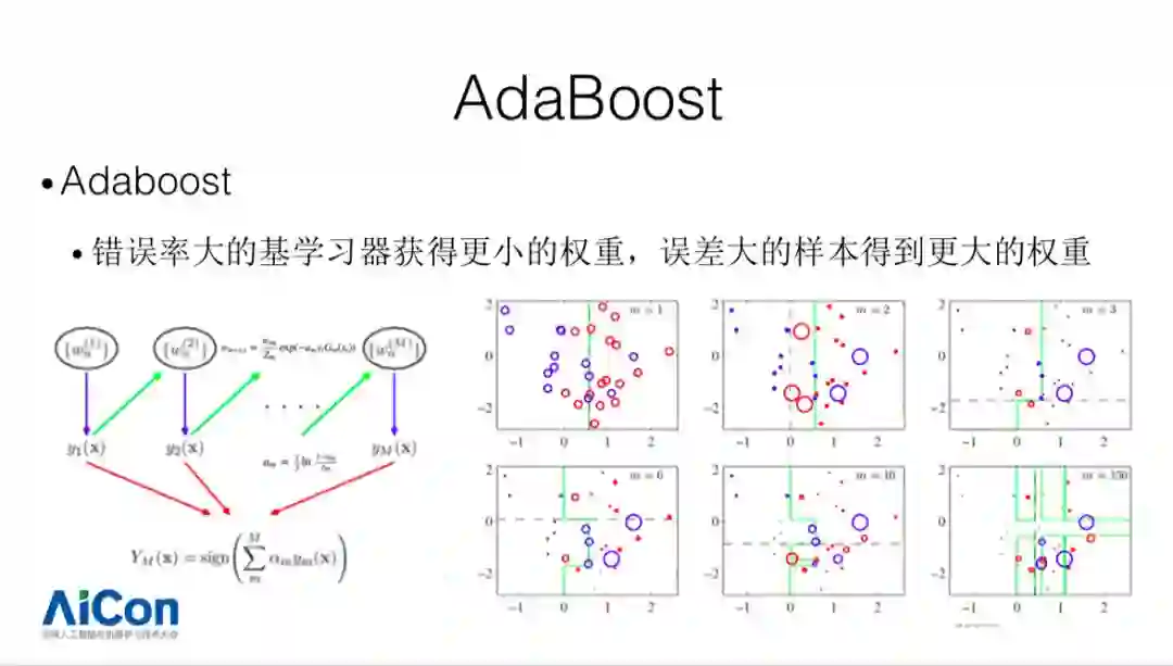 我们今天主要集中在树模型的迭代优化,我们看一下树模型以及 XGB 的简述。Boosting 目前有两种类型,Adaboost 和 Gradient Boost。Adaboost 中,错误率大的基学习器获得小的权重,误差大的样本得到更大的权重,这里可以使用错误率设置它们对应的权重,通过这种方法提升弱分类器在组合过程当中的效果,组合成更加强大的分类器。