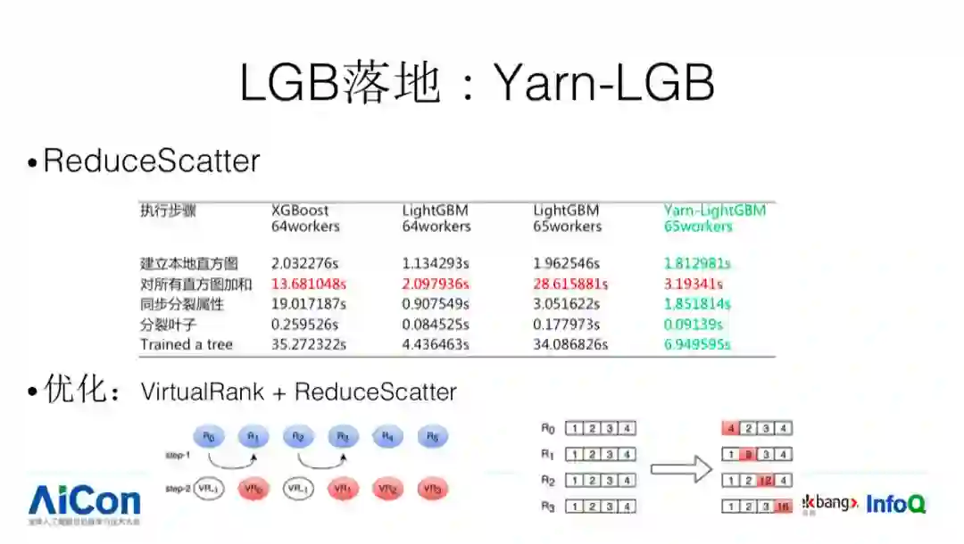 此外,我们还做了一些其他优化。ReduceScatter 比较强的依赖于我的节点必须是 2 的 N 次方,很多情况下不一定是 2 的 N 次方,针对这种情况我们可以看下速度变化情况,64 个节点情况下直方图求和的时间,XGB 是 13 毫秒,LGB 是 2 毫秒,如果变成 65,LGB 从 2 毫秒变成 28 毫秒,针对这个可以做一些优化,使用 VirtualRank+ReduceScatter 的方法,使得时间从 28 毫秒降到 3 毫秒。