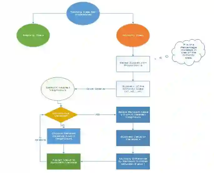 这一技术可用来避免过拟合——当直接复制少数类实例并将其添加到主数据集时。从少数类中把一个数据子集作为一个实例取走,接着创建相似的新合成的实例。这些合成的实例接着被添加进原来的数据集。新数据集被用作样本以训练分类模型。