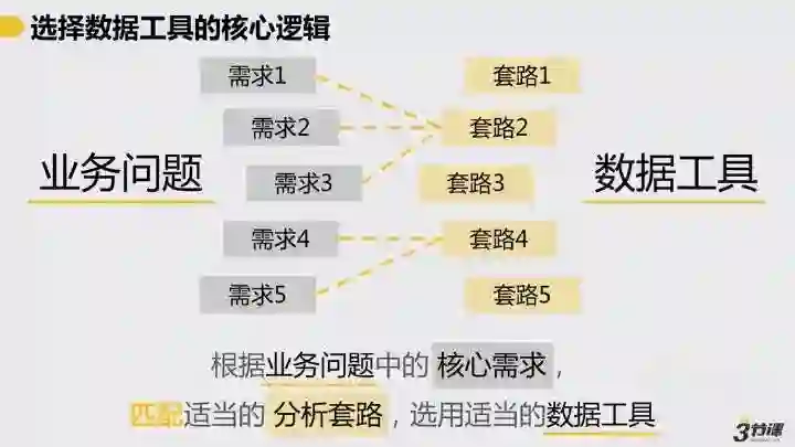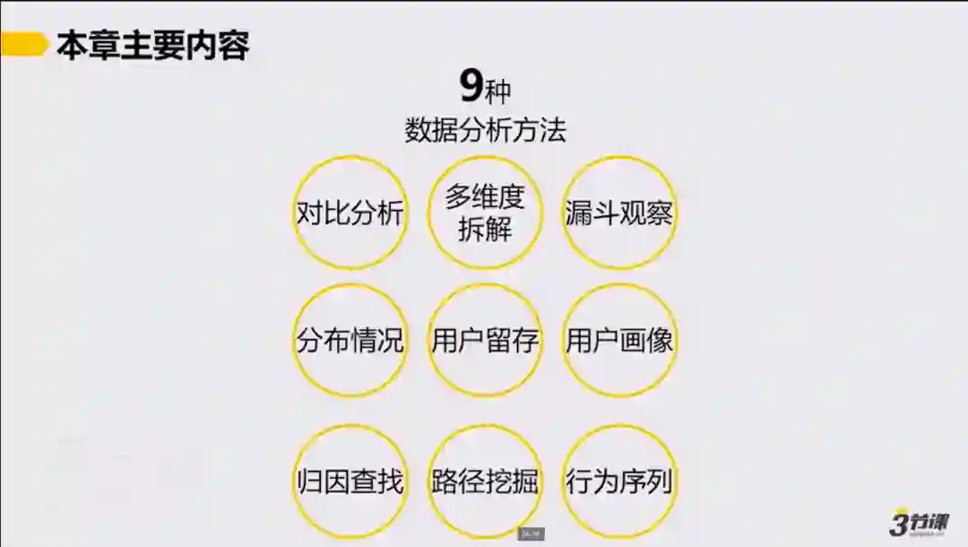 比如,面对大家「不知道怎么分析数据」「拿到数据不知如何下手」等情况,课程中会带给大家 9 种常见的数据分析方法,更重要的是,告诉你在什么情况下使用什么方法才有效: