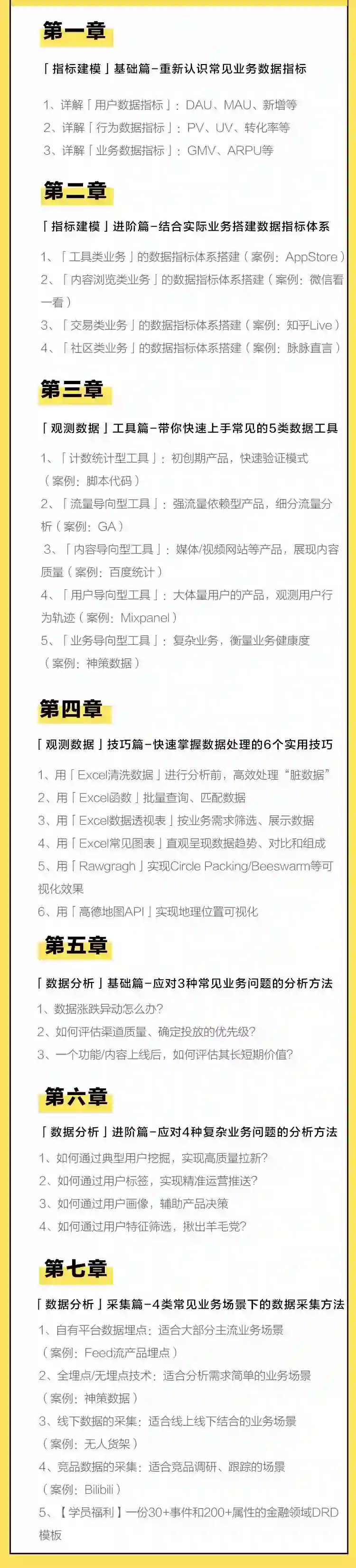 第三,这门课程不会教你编程、也不会教你代码!只会在100+个实战案例中,训练产品、运营、市场等业务同学常见场景的数据分析思路,帮大家了解数据分析语境下的核心定义、工具、方法,弥补你面对数据“毫无分析思路”的“硬伤”!