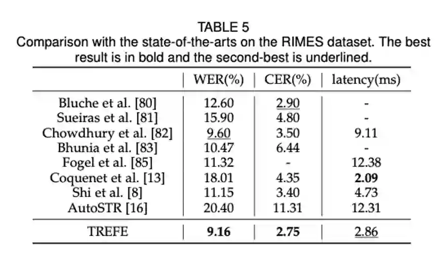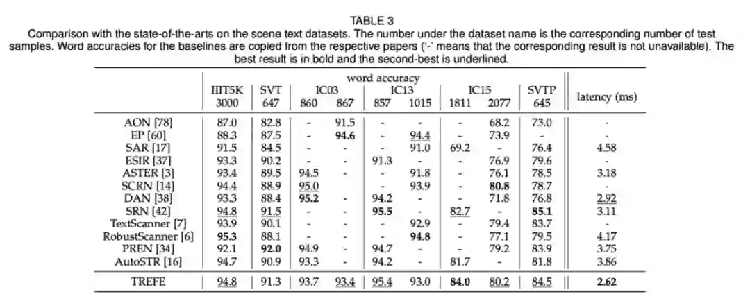 本文将 TREFE 与 SOTA 方法在手写文本和场景文本识别任务上进行了对比,为了简单起见,没有使用任何词汇或语言模型。