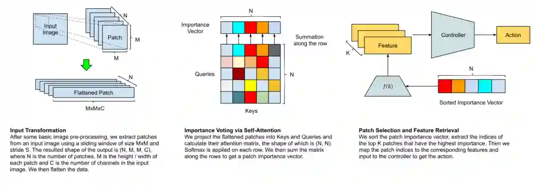通过自我注意力进行重要性投票。为了确定哪些小块是合适的,智能体会把所有小块都输入到一个自我注意力模块,从每个小块上都获得一个表示了它的重要性的向量,然后从中选出K个重要性最高的小块