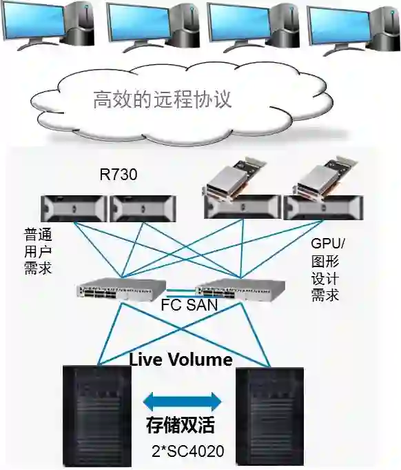 ★ 通过R730服务器集群,Dell EMC CML 的双活技术解决了桌面端的高可用问题,使得整个后端基础架构成为一个全活架构。