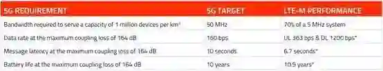 2018年3月,Sierra Wireless、爱立信、Altair等20家知名厂商联合发布了LTE-M(eMTC)满足5G要求的评估报告,报告更是从单位容量带宽需求、数据速率、消息时延、电池寿命等多方面进行评估,结果显示eMTC的性能完全符合ITU提出的5G物联网的需求。