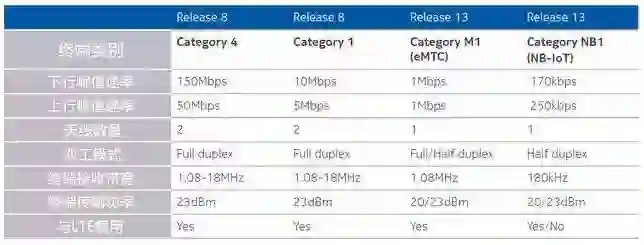 早在2008年,LTE的第一个版本R8(Release 8)中,除了有满足宽带多媒体应用的Cat.3、Cat.4、Cat.5等终端等级外,也有上行峰值速率仅有5Mbit/s的终端等级Cat.1,可用于物联网等“低速率”应用。
