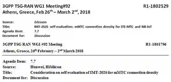 在希腊雅典召开的3GPP会议上,相关企业就提交了针对NB-IoT和eMTC满足5G mMTC连接密度的需求评估报告。相关报告的结论显示,NB-IoT和eMTC满足了ITU提出的5G mMTC连接密度的需求,这给NB-IoT和eMTC纳入5G物联网家族打下来基础。两份评估报告如图: