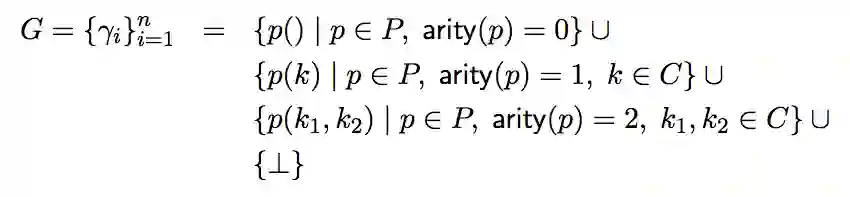 语言决定了所有基础原子的集合G。为了收紧搜索空间,研究人员限制了谓词元数的范围(不超过2),因此: