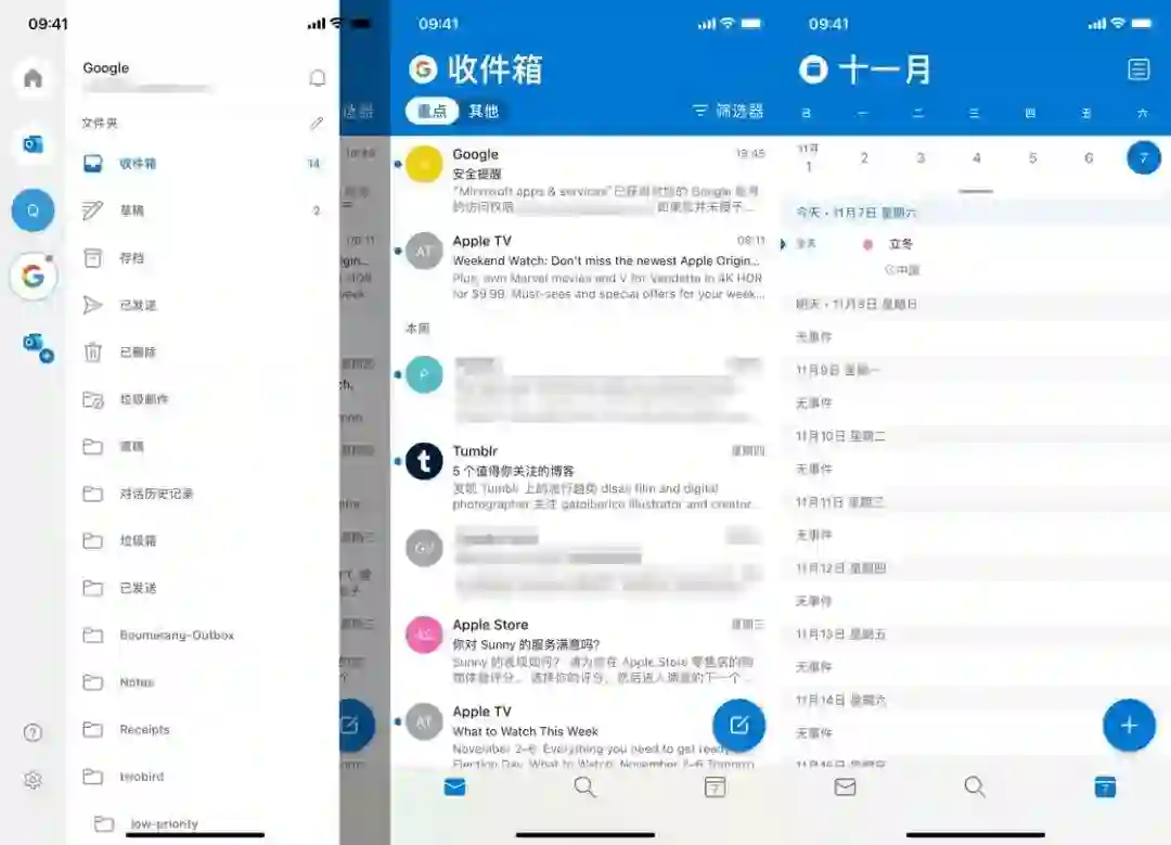 来自微软的 Outlook 同样也是相当不错的邮件应用。应用通过「重点」与「其他」来区分邮件,为你突出展示重要内容。同时,Outlook 还内置了日程日历,方便你调整自己的工作日程。