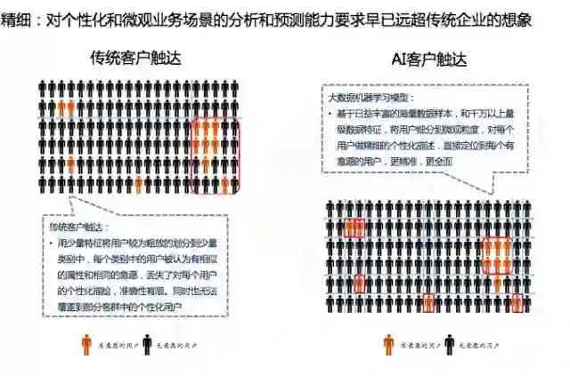 如今,我们利用AI技术,可以实现更加精细的分析和预测。就像上图表示的一样,传统的方式是基于一些规则将人群划分,假设全国有两亿名移动支付用户的话,划分为上百种人群,单一群体就有两千万,丢失了对每个客户的个性化描述。