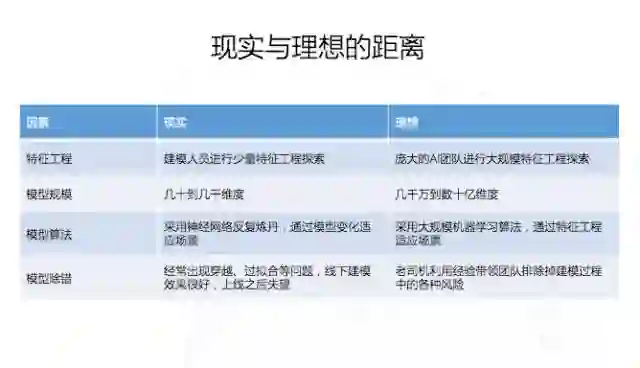 所以,采用专家规则的话,每隔三个月到半年就要对规则进行更新,人工智能则不然,我们可以基于数据做成一个闭环的系统,它能够用机器代替人,从广泛的数据当中筛选出海量的规则,并且规则以及权重可以随着时间(数据)的变化而变化,整个系统就具备了智能(自学习)的能力。