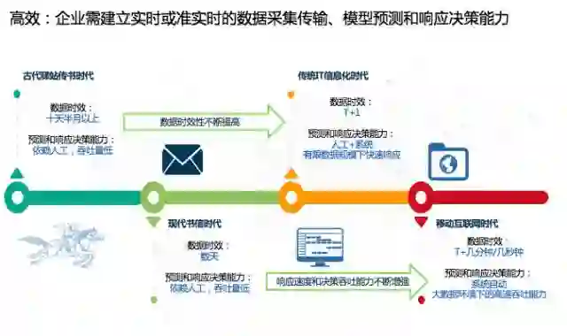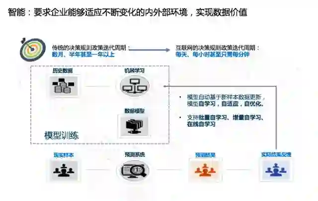 最后一点是高效。之前提及的反欺诈、新闻推荐、营销等领域,它们对实时性的要求越来越高,反欺诈系统必须在几十毫秒之内判定交易是否有问题,营销系统需快速判定客户对某个商品的消费意愿。在某种意义上讲,企业需要建立实时或者准实时的数据采集传输、模型预测和响应决策能力,这样智能就从批量性、阶段性的行为变成一个可以实时触达的行为。