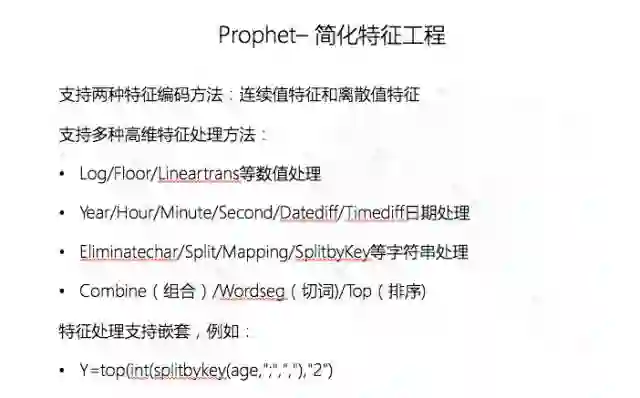 该过程以往要技术人员去写SQL或者Spark脚本的方式产生,如今在先知中,机器可以自动产生脚本、程序,其中有两种特征编码的方式和支持多种高维特征处理方法,像数值处理,日期处理,切词和排序等等。