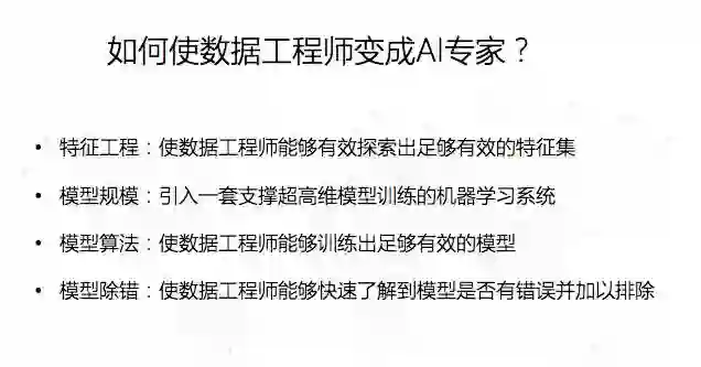 如何把一个团队的数据工程师变成AI专家呢?我们认为需要对下图这四个方面进行一些改进。首先是特征工程,它是把原始的数据通过一些方式进行衍生,能够把人群能够划分足够精细的这么一种变量衍生的方式。