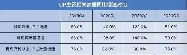 本季度,B站月均活跃UP主数量同比增长51%,月均投稿量同比增长79%,拥有万粉以上的UP主数量同比增长75%,增速都有所下滑,一方面是由于UP主群体基数大了,增速自然下滑,另一方面是疫情期间宅家导致的创作热度在复工复产后下降。