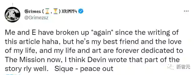 2018 年 5 月,马斯ma si克与加拿大音乐家 Grimes 一起抵达大都会艺术博物馆的年度服装学院晚会。当时,据说这对夫妇已经「秘密约会」了几个星期,两人的恋情正式曝光。而两个人的相遇是在Twitter上。当时马斯克发推,开一个关于人工智能的笑话,特别是关于她的视频「Flesh Without Blood」中的洛可可怪兽(Rococo Basilisk)角色的笑话,并发现他的梗已经完败于她。马斯克曾表示,他喜欢Grimes的「狂野的艺术创造力和过分的职业道德」。在他们的断断续续的关系中,Grimes一直是马斯克的坚定捍卫者。她多次在Twitter上捍卫马斯克和他的Tesla。在被删除的推文中,Grimes说,马斯克从未试图阻止Tesla工人的工会化,并声称她鼓励Tesla员工之间的工会投票。马斯克还曾发出了那条臭名昭著的推文:「我正在考虑以420美元的价格将Tesla私有化。资金已经到位。」 这使得Tesla股价一度大跌,马斯克涉嫌股票欺诈和误导。美国证券交易委员会立刻介入调查,但最后发现:马斯克发这个420美元的股价,就是一个来逗Grimes的玩笑。为这个玩笑,马斯克和Tesla与美国证券交易委员会达成和解,同意各自支付2000万美元。马斯克还同意辞去Tesla董事会主席一职,并任命一个委员会来监督他的通讯。说这是现代版的「烽火戏诸侯」,一点儿都不为过。马斯克当了一回周幽王,而Grimes就是那位「千金一笑为红颜」的褒姒。这样的人生,实在太爽了。「周幽王」和「褒姒」的日子,一晃就过了两年~~~2020年1月,Grimes丢下了一个重磅炸弹:她在自己的Instagram和Twitter上发了一张大肚裸照,暗示她实际上已经怀孕。2020年5月,马斯克和Grimes的爱情结晶诞生,起名X Æ A-Xii 。但是名人的生活,总是我们常人难以理解的吧!看似华丽、人人称羡的生活的背后,个中滋味也不是我们常人所能想象的!纵然千般好景,其实也不过只持续了三个春秋!马斯克和女友Grimes在一起3年后,也就是2021年9月两人宣布分手。不过,这个「分手」可能和传统意义上的「分手」不大一样。分了,但是又没完全分。那到底是藕断丝连?还是「开放式情侣」?据悉,他们分手的主要原因是,马斯克当前在SpaceX和特斯拉的工作要求其主要待在得克萨斯州或海外旅行,而Grimes的工作主要在洛杉矶。What?钢铁侠也抵不过不靠谱的异地恋?既然两个人的分手不是传统意义上的分手,那他俩到底是哪门子的分手呢?两个人的分手状态就比较劲爆了——比如分手之后,还能继续生个娃什么的,真可谓是,世界之大,无奇不有!就在两人官宣分手后不久,三个月后——2021年12月,Grimes和马斯克的第二个女儿诞生!据Grimes对《名利场》透露,这个女儿是通过秘密代孕生下来的,全名是Exa Dark Sideræl,他们还给她取了个小名:Y。而Y这个小名,是继承自二人22个月的大儿子X Æ A-12。是不是快惊讶到下巴脱臼了!留步,事情还没结束!两人分手后,马斯克经常被发现与澳大利亚女演员娜塔莎·巴塞特在一起约会,据称两人经常一起搭乘马斯克的私人飞机。然而,在接受《名利场》记者采访时,Grimes表示,她和马斯克实际上已经复合了,尽管目前的关系很不稳定。她说「我找不到一个合适的词来形容我们的关系,我可能还会把他称为我的男朋友,但我们很不稳定。我们住在不同的地方。我们还是最好的朋友。我们经常互相来往,只是有自己的事情要做。」「不过,我不指望其他人能理解我们的关系。」Grimes还说,她和马斯克在一起很开心,这是有史以来最好的关系,两人只是「需要自由」。而且,这个孩子可能只是个开始,二人未来还计划生更多的孩子。「我们一直希望能生三四个」,她说。不过,在《名利场》的封面文章发出之后,Grimes再次发推,称自己和马斯克「又分手了」,但仍然称马斯克为最好的朋友和一生真爱。迂回曲折、跌宕起伏的情节,小说家应该都不会有这么大脑洞去写吧。我们依旧是平凡的我们,过着平凡的生活,马斯克的非同寻常并不是我们常人所能演绎的。踏踏实实扮演好自己生活中的角色就是我们最大的不平凡了!今天的故事分享到这里就结束了,瓜也吃完了,散了吧~~~~~