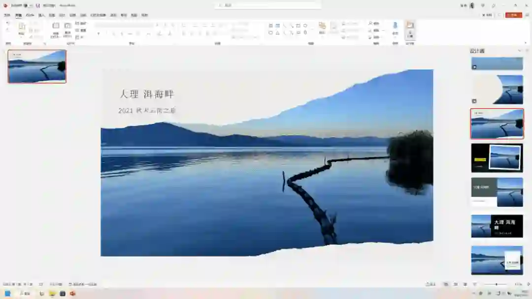 由于推出时间不久,Microsoft Designer 对中文的支持也不太友好,而 PPT 作为国民级工作软件之一,针对中文的适配已经相当成熟。还是以上面的洱海主题为例,在 Microsoft Designer 中,无论更换什么模板,文字基本都是相对现代风格的无衬线字体;而 PPT 则可以根据风格的不同,自动在衬线字体与非衬线字体中切换