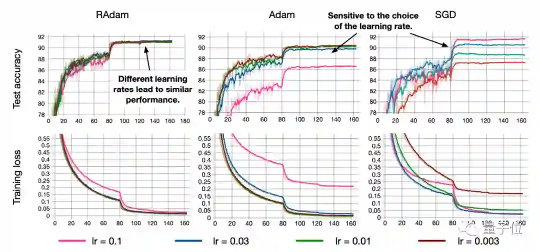 RAdam的先进之处在于,能根据方差分散度,动态地打开或关闭自适应学习率,提供了一种不需要可调参数学习率预热的方法。它兼具Adam和SGD两者的优点,既能保证收敛速度快,也不容易掉入局部最优解,在较大学习率的情况下,精度甚至优于SGD。