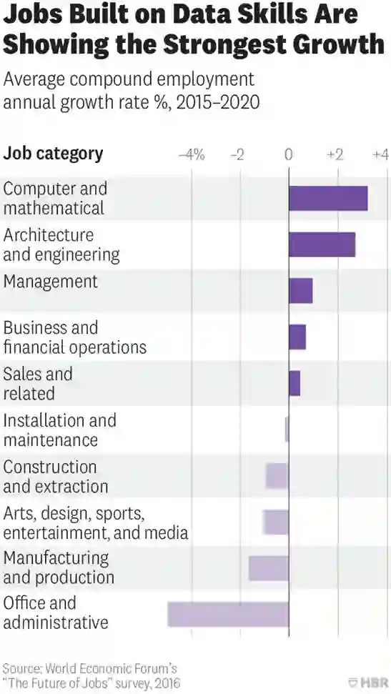 数据技能(Data skills)——将数据转化为洞察力和行动的能力——成为现代经济的驱动力。根据世界经济论坛的报告,受到劳动力市场变化影响工作岗位逐渐萎缩,专注于计算和数学领域的工作岗位却呈现出最强劲的增长势头。