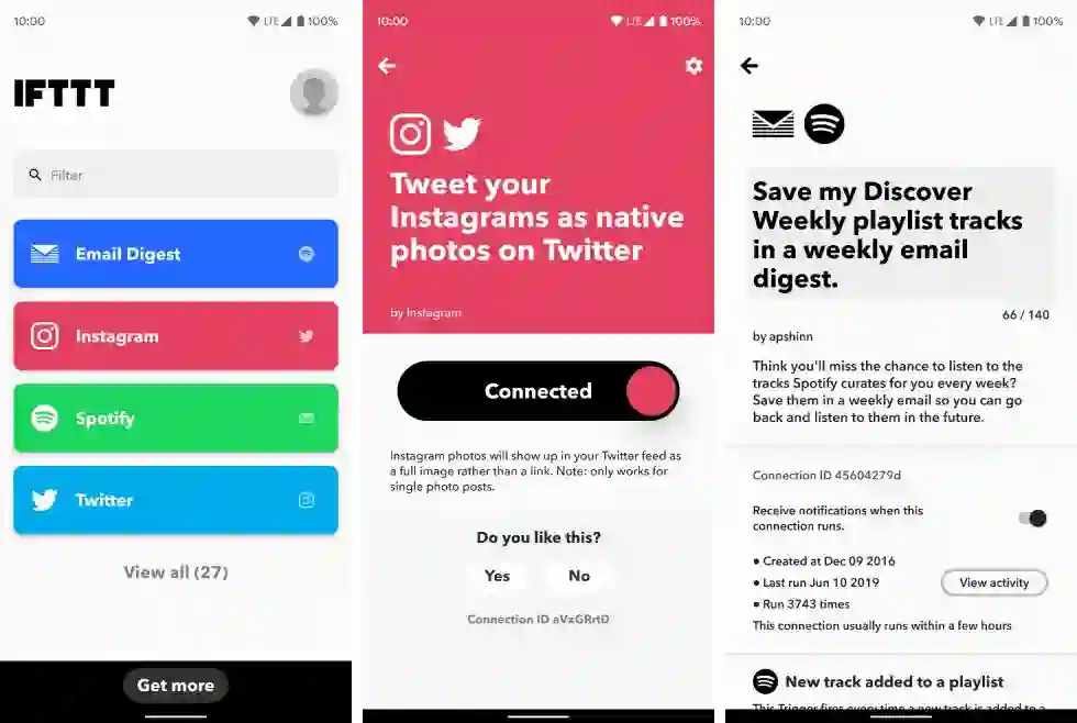 IFTTT(Android):IFTTT Android 版近期正在封闭测试全新的 UI 设计,新设计对当前正式版的主界面进行了完全重构,主界面采用更简洁的单页列表来呈现服务及相关的自动化规则,具体的规则设定和规则触发情况查看入口被藏到了更深的位置,同时启用新自动化规则的流程也得到了大幅精简。