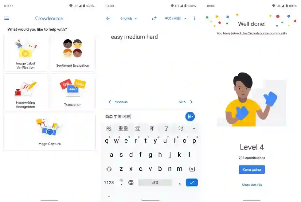 Crowdsource(Android):继今年 2 月获得整体视觉风格更新后,Google 众包应用 Crowdsource 上周再次更新了应用内界面设计细节并换上了与 Google 商标同一色系的新 logo。借助众包应用,用户可以对 Google 旗下多款在线服务进行完善,包括改善图像标注结果、提高翻译质量等等。