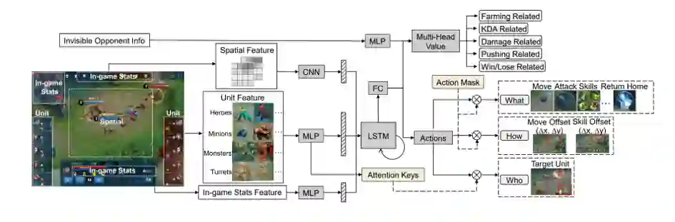 首先,团队构建了一个最佳神经网络模型,让模型适配MOBA类任务、表达能力强、还能对英雄操作精细建模。模型综合了大量AI方法的优势,具体而言,在时序信息上引入长短时记忆网络(LSTM)优化部分可观测问题,在图像信息上选择卷积神经网络(CNN)编码空间特征,用注意力(Attention)方法强化目标选择,用动作过滤(Action Mask)方法提升探索效率,用分层动作设计加快训练速度,用多头值估计(Multi-Head Value)方法降低估计方差等。