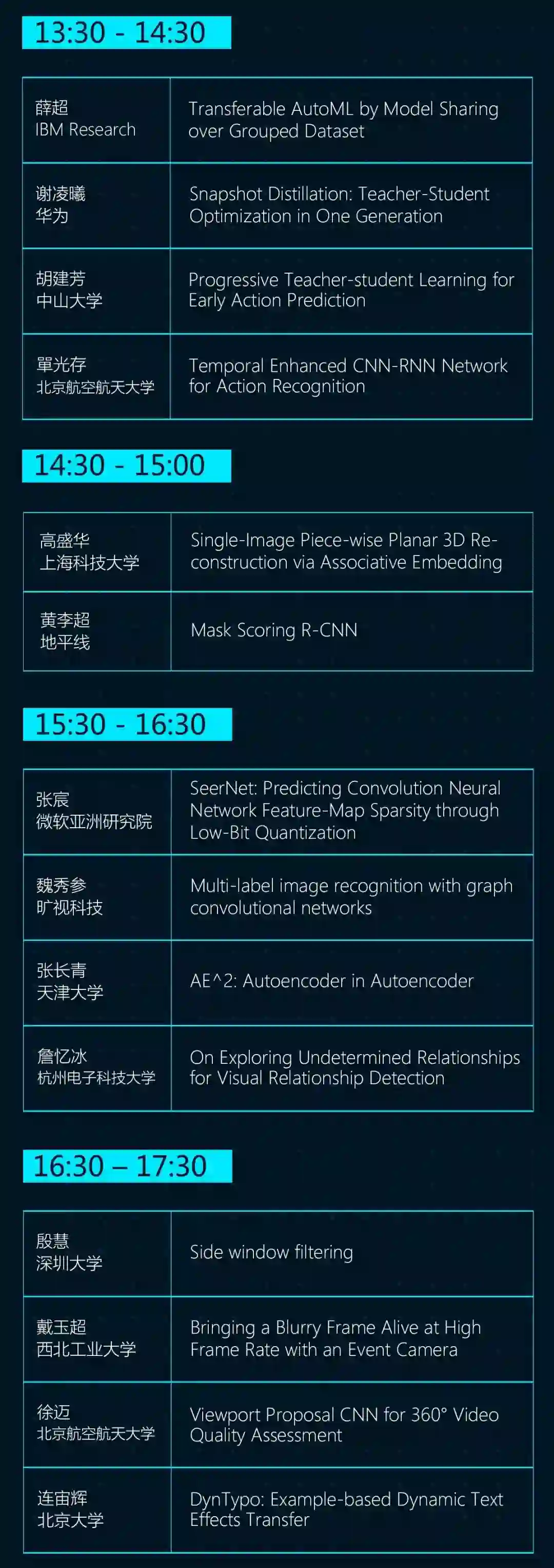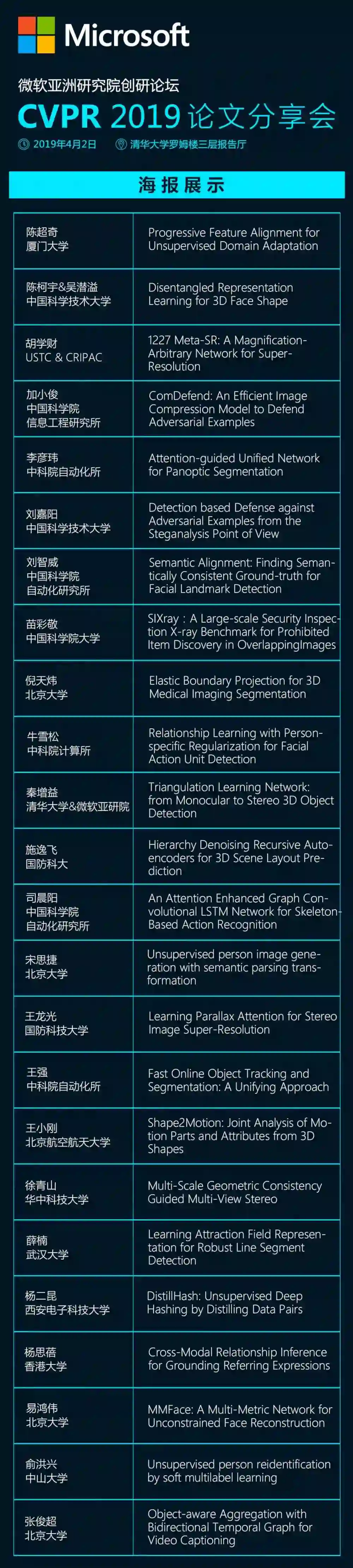 在此之前,来自国内外计算机视觉领域学术界、工业界的优秀代表们将携各自在CVPR 2019发表的最新研究和技术观点,于4月2日(下周二)举行的“微软亚洲研究院创研论坛 CVPR 2019 论文分享会”上进行交流、分享。