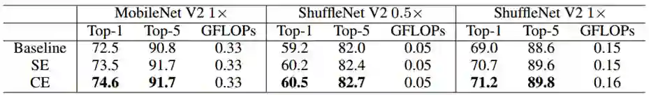 在高效的轻量级网络上,CE依然具有明显的优势。对于MobileNetV2,CE相比于SE在ImageNet上的top-1分类准确率提升了1.1(74.6 vs 73.5)。