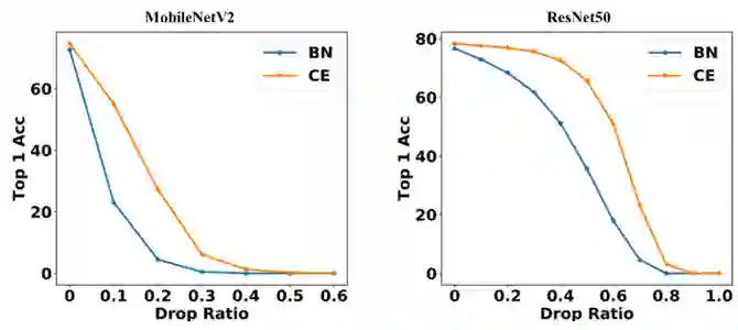 我们运用[6]中的Cumulative ablation curve(CAC)曲线观察卷积网络中的通道是否均衡。对于一个训练好的卷积网络,可以随机切除一些通道,测量只有剩余通道的网络的性能损失,通过这个相对的性能损失,我们可以衡量网络中的通道对网络输出的贡献是否均衡。比如,如果一个网络十分依赖一部分相对重要的通道,那么当网络中的通道不断的被随机切除后,网络的性能会下降的更快。