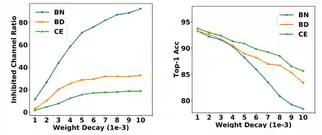 根据[7]中的经验,提高weight decay的强度可以增大网络中抑制通道的数量。我们发现,随着weight decay的增大,只使用BN的网络中的抑制通道数量增加,而引入本文提出的CE模块以及CE的子模块BD的时候,抑制通道数量显著降低,即使在很大的weight decay强度下,CE仍然能保持相对高的分类准确性。