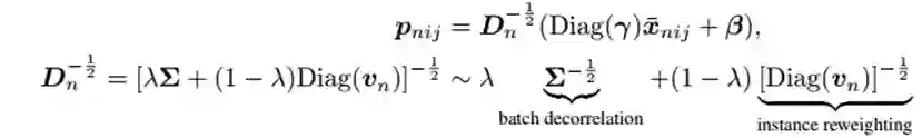 具体而言,CE采用去相关(Decorrelation)的方法白化归一化层的输出,使得导出的特征图的协方差矩阵成为单位矩阵,这样不同通道在量级上就变得各项同性了。与之前的去相关方法不同的是,CE在在批量估计的协方差矩阵的对角上引入自适应的条件方差,为每个输入单独计算协方差矩阵,从而实现样本特异的去相关操作。基于这样的设计,CE可以分为两个互补的分支,批量去相关(BD)和实例再加权(IR),用公式可以表述为: