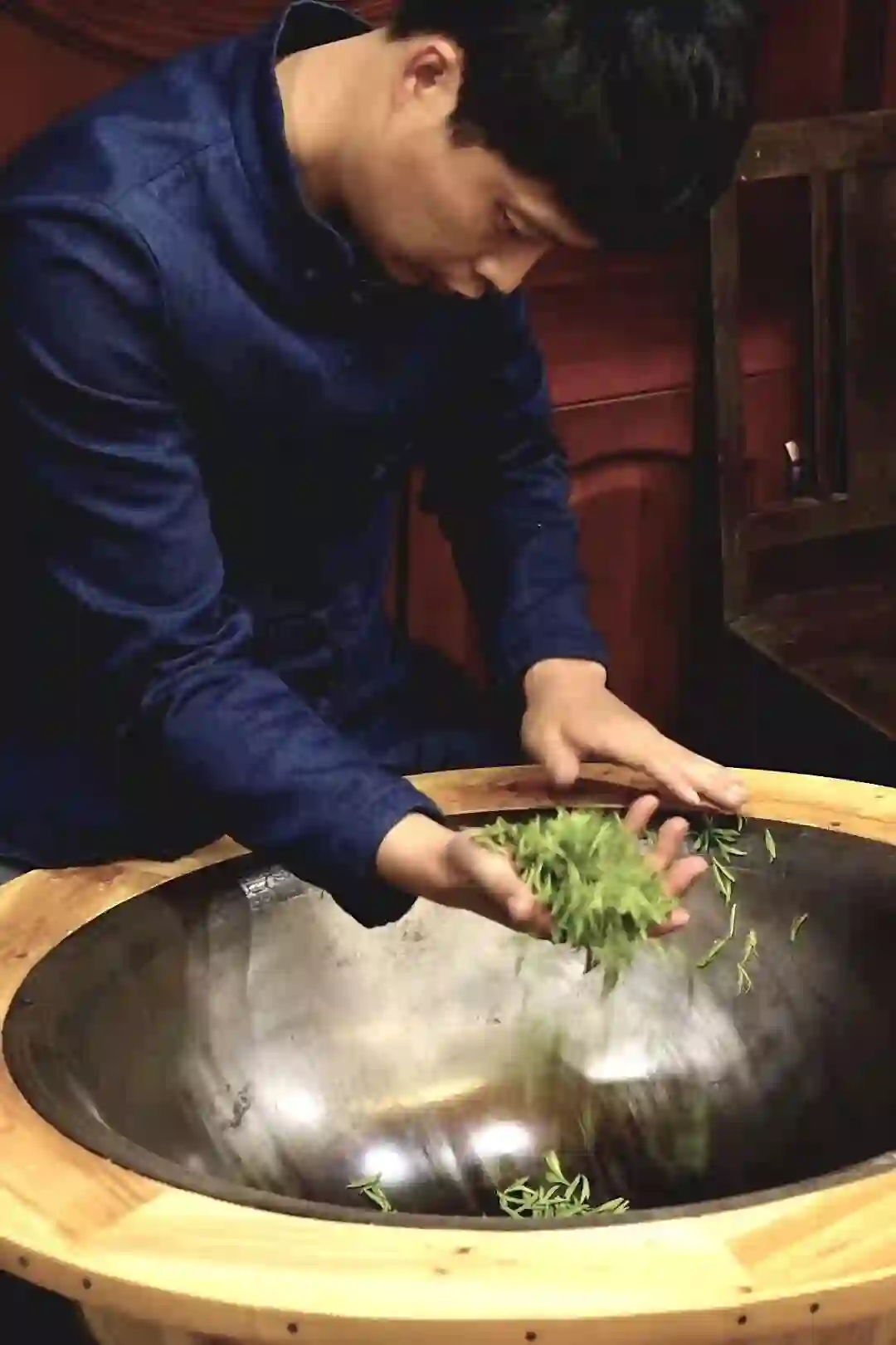 说来只是一两句话,但古诗有云,“纸上得来终觉浅,绝知此事要躬行”。青锅学个3年可以做到有模有样,辉锅就没那么容易了。由于辉锅时的锅温达100多摄氏度,叶面温度达到80多摄氏度,炒茶人必须做到手不离茶,茶不离锅,没有几十年的高温历练,很难做到。唐小军最得意的大弟子张海浪15岁便开始跟随他学制茶,至今有21年,已经是西湖一带除了唐小军以外赫赫有名的制茶人,但他依然谦虚地承认,他炒的茶还有精进的空间。