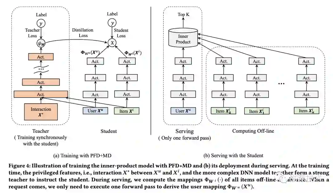 再来详述一下这个过程。在离线环境下,会同时训练两个模型:一个学生模型和一个教师模型。其中教师模型额外利用了优势特征,则准确率更高。将教师模型蒸馏出来的知识传递给学生模型,辅助其训练,提升学生的准确率。线上服务时,只用学生模型进行部署,由于输入中不依赖优势特征,则保证了线上线下特征的一致性。本文中的蒸馏知识是通过教师模型中的最后一层输出进行传递。作者给这个模型起名为PFD。
