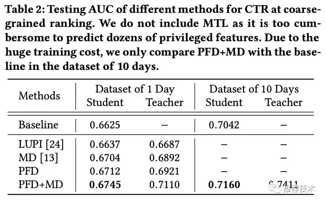 统一蒸馏:走到这里,可以考虑将MD和PFD合在一起做进一步提升了。更强的教师模型怎么选择呢?这里感觉还是比较巧妙的,本文直接拿精排的CTR模型来做粗排的教师模型,所以也就是让粗排反向学习精排的打分结果。