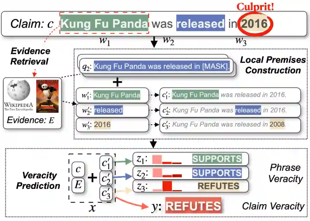 针对第二个问题,作者将其建模为一种阅读理解 (MRC) 任务。给定陈述和短语,首先对给定的短语构造引导问题,如「Kung Fu Panda was released in [MASK].」和「When was Kung Fu Panda released?」,并利用 MRC 模型从证据集中获取到对应的事实部分,如证据集中存在描述「Kung Fu Panda premiered in the United States on June 6, 2008.」,那么我们希望模型能够回答出「2008」。