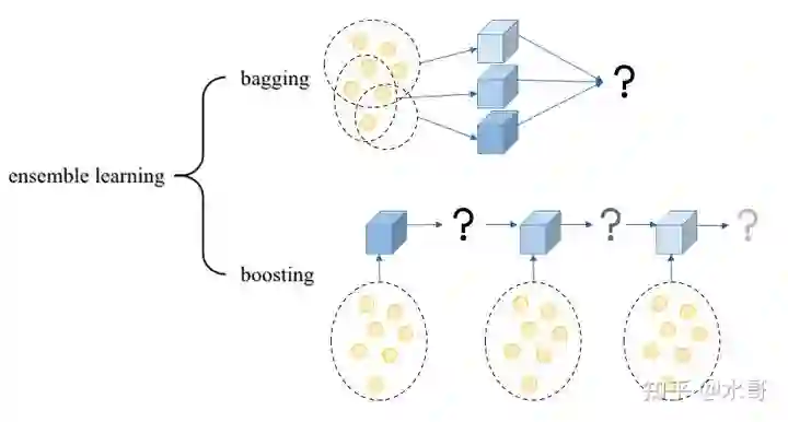 Boosting和树模型总是一起出现的,本质原因是树模型往往比较弱,而当我们不满足一个模型的能力,想要用多个模型来融合达到最佳结果,这种方法就是集成学习,即ensemble learning。而ensemble learning又可以分为两种:bagging和boosting,如下图所示: