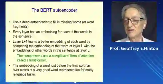 「上下文信息是最好的老师」。Hinton举例,「She scromed him with the frying pan」,即使我们没见过「scromed」,通过下文的平底锅,也能大概猜测出「scromed」的意思,拿个平底锅能干啥好事呢?