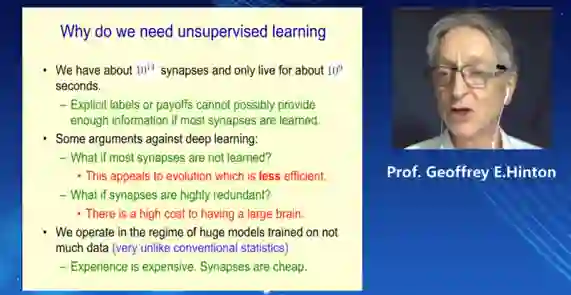 人类大脑有10^14个神经元连接,而人的一生只有10^9秒,因此人类仅靠监督学习是无法完成所有神经元训练的,我们的深度学习模型也是如此,只用监督学习无法取得更新的进展,要将无监督学习融入进来。