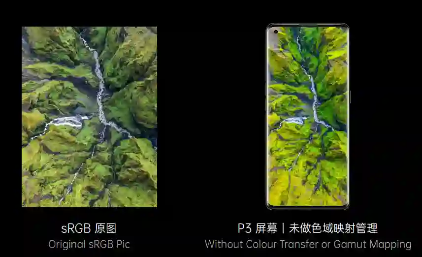 OPPO的解决方式,是在 DCI- P3 色域的屏幕上,针对 DCI-P3 图片,直接按照图片的内容显示,而针对 sRGB 图片,技术团队会对 RGB 坐标数据做线性化和逆线性化两次处理,最终在 DCI-P3 屏上准确显示,从而解决采集端和显示端因色域描述方式不同而造成的色彩偏差问题,能带给用户更精准的视觉体验。