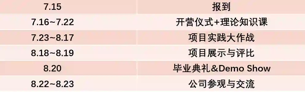 训练营时间为 2019 年 7 月 15 日-8 月 23 日,共 5 周,流程安排如下: