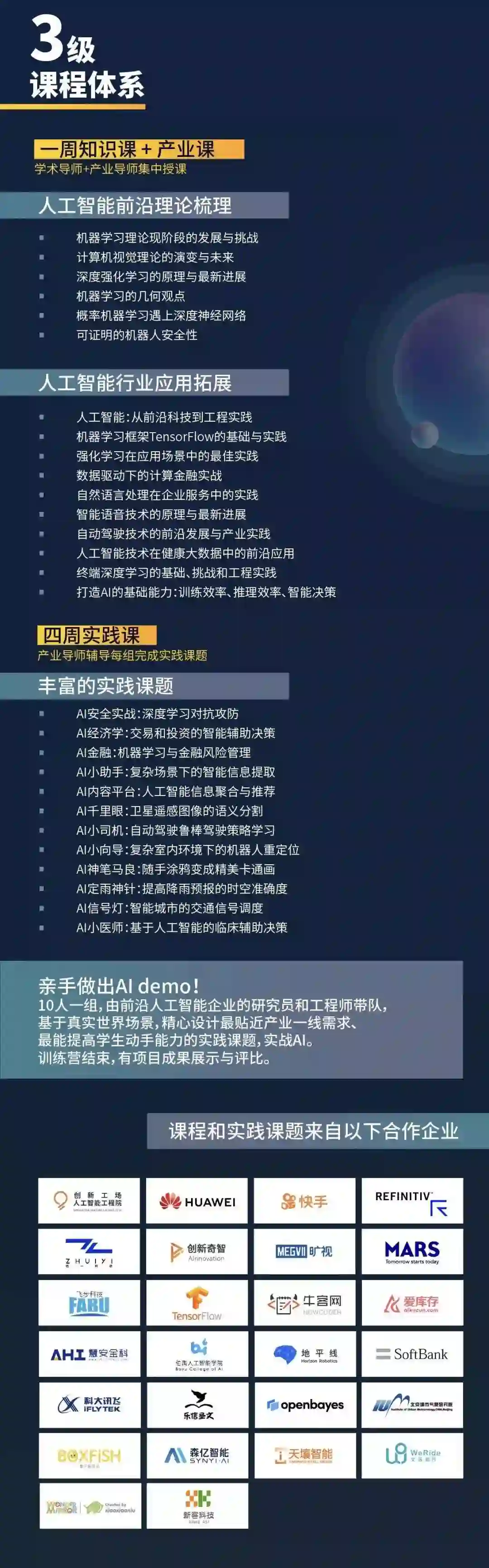 通过「1 周理论知识+4 周项目实践」的形式,一方面瞄准国际前沿科技方向,邀请学术大师讲授最先进的教学理念;另一方面从产业需求出发,强调项目实践在 AI 教学中的重要作用,课题由合作企业基于真实世界场景精心设计,使用来自工业界的真实数据或案例,帮助学生接触第一手的产业信息,完成自己的 AI 项目成果,迅速成长为产业人才。