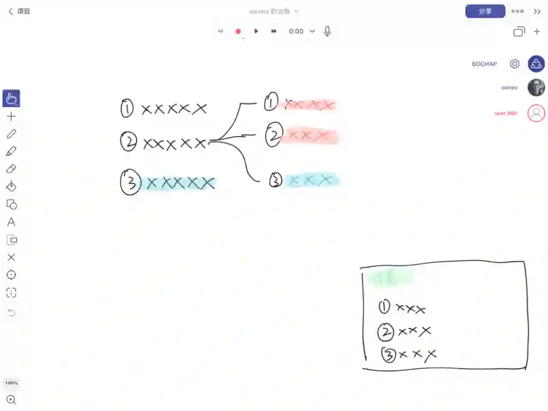 Explain Everything 是一款白板工具,提供了 App 和网页版本。除了可以通过 App 参与会议,非注册用户也可以直接在网页端输入会议代码加入会议,简单易用。Explain Everything 为 iPad 版本加入了 Apple Pencil 的支持,利用硬件优势,我们可以在 iPad 上轻松进行手写编辑和涂鸦,实现头脑风暴。