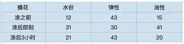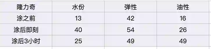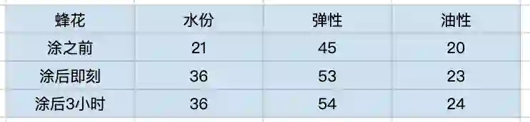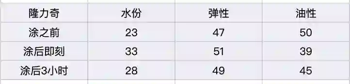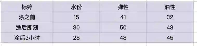 本次保湿测评每款身体乳分别安排了两位超人测评皮肤最干燥的测试员在手臂上涂抹,用皮肤水油检测仪对涂抹之前、涂抹吸收后即刻、涂抹后三小时后的皮肤状态进行检测。分别检测了皮肤水分、弹性、油分三个基础数值,以下表格中的数据单位为%。