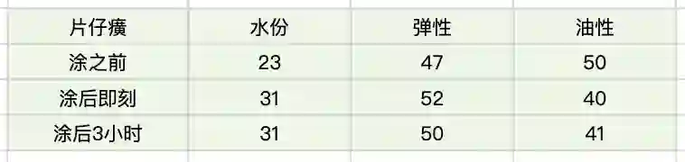 (以下为两位测试员,“涂抹之前”、“涂后即刻”、“涂后3小时”的皮肤检测数据)