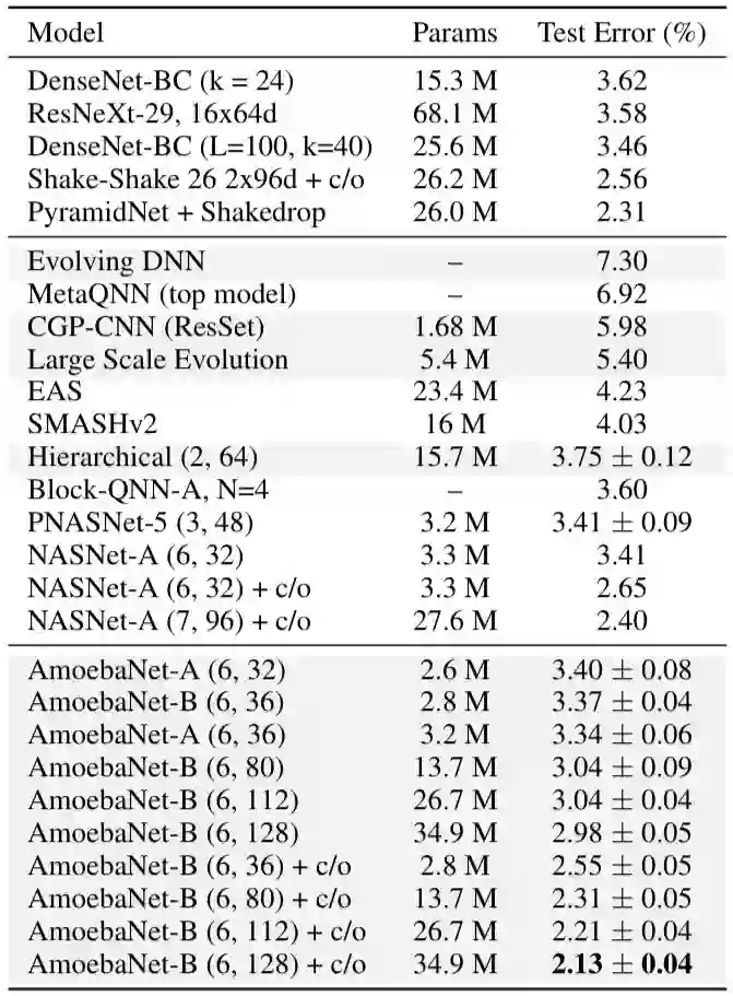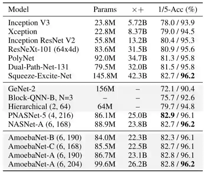 在相同的实验条件下,基线研究得到了NASNet-A。表2显示,在CIFAR-10数据集中,AmoebaNet-A在匹配参数时错误率较低,在匹配错误时,参数较少。同时在ImageNet上的表现也是目前最好的。