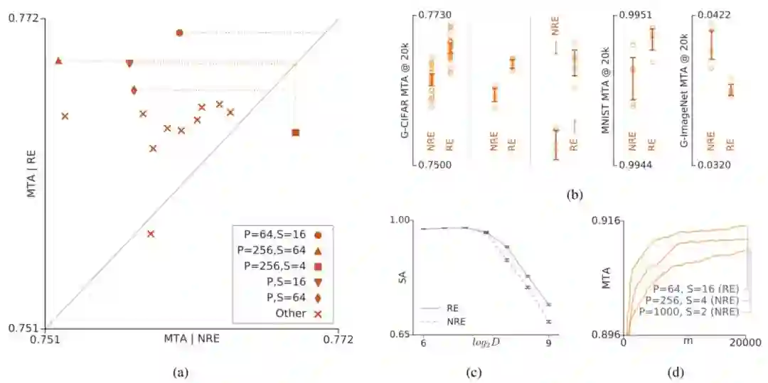正则化与非正则化进化的对比。(a)表示在G-CIFAR数据集上非正则化进化和正则化进化用不同的元参数进行的小规模实验结果对比。P代表样本数量,S代表样本大小。(b)表示NRE和RE在五种不同情况下的表现,从左至右分别为:G-CIFAR/SP-I、G-CIFAR/SP-II、G-CIFAR/SP-III、MNIST/SP-I和G-ImageNet/SP-I。(c)表示模拟结果,竖轴表示模拟的精确度,横轴表示问题的维度。(d)表示在CIFAR-10上进行的三次大规模试验。