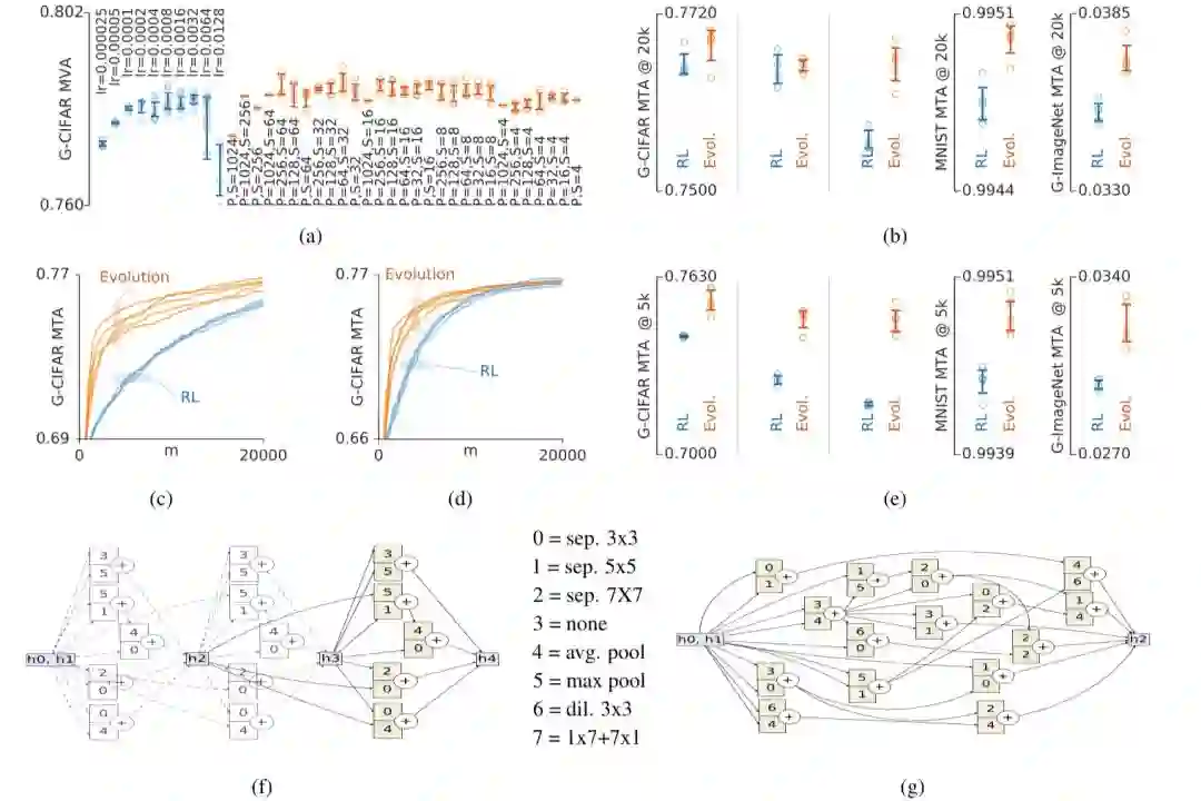 (a)显示了在G-CIFAR上对超参数进行优化的实验总结,竖轴表示实验中前100名的模型的平均有效精度。结果表明所所有方法都不够敏感。(b)同样是在模型五种不同情况下的表现:G-CIFAR/SP-I、G-CIFAR/SP-II、G-CIFAR/SP-III、MNIST/SP-I和G-ImageNet/SP-I。(c)和(d)表示模型分别在G-CIFAR/SP-II和G-CIFAR/SP-III上的表现细节,横轴表示模型的数量。(e)表示在资源有限的情况下,可能需要尽早停止实验。说明了在初始状态下,进化算法的精确度比强化学习增长得快得多。(f)和(g)分别是SP-I和SP-III最顶尖的架构。